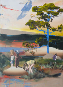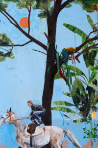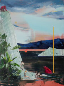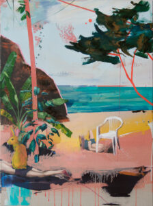 Little games: pink bear with bird. 90x140cm. Oil and acrylic on canvas (2016)Available, My studio Budapest